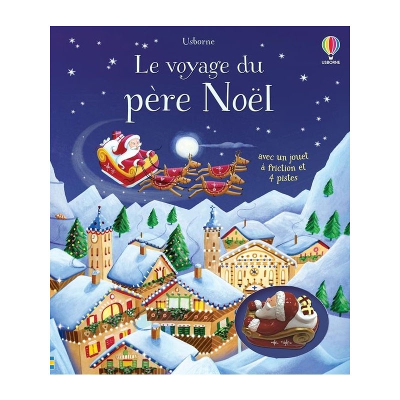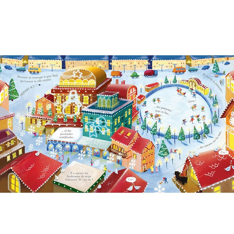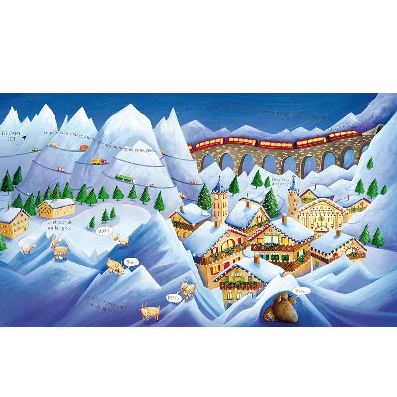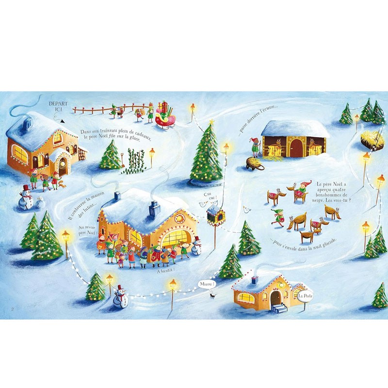 Dans cet ouvrage les enfants pourront suivre le père Noël dans son voyage, en plaçant son traîneau sur les pistes creusées à chaque page. Ils pourront le voir quitter don atelier et son village la veille de Noël, survolant un village montagnard recouvert de neige et une ville très animée. Il se posera ensuite sur les toits pour distribuer ses présents aux enfants endormis.